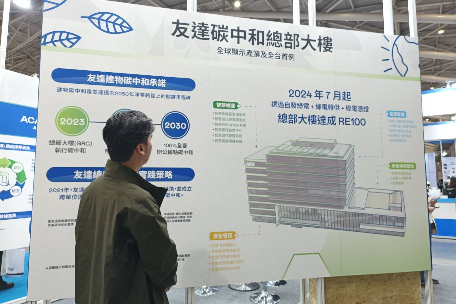 同時,於「淨零碳排與新能源」專區展示碳中和建物及減塑的實踐成果。友達期許透過創新綠色技術解決方案,協助企業實踐淨零轉型,共同構建一個更美好的永續未來。